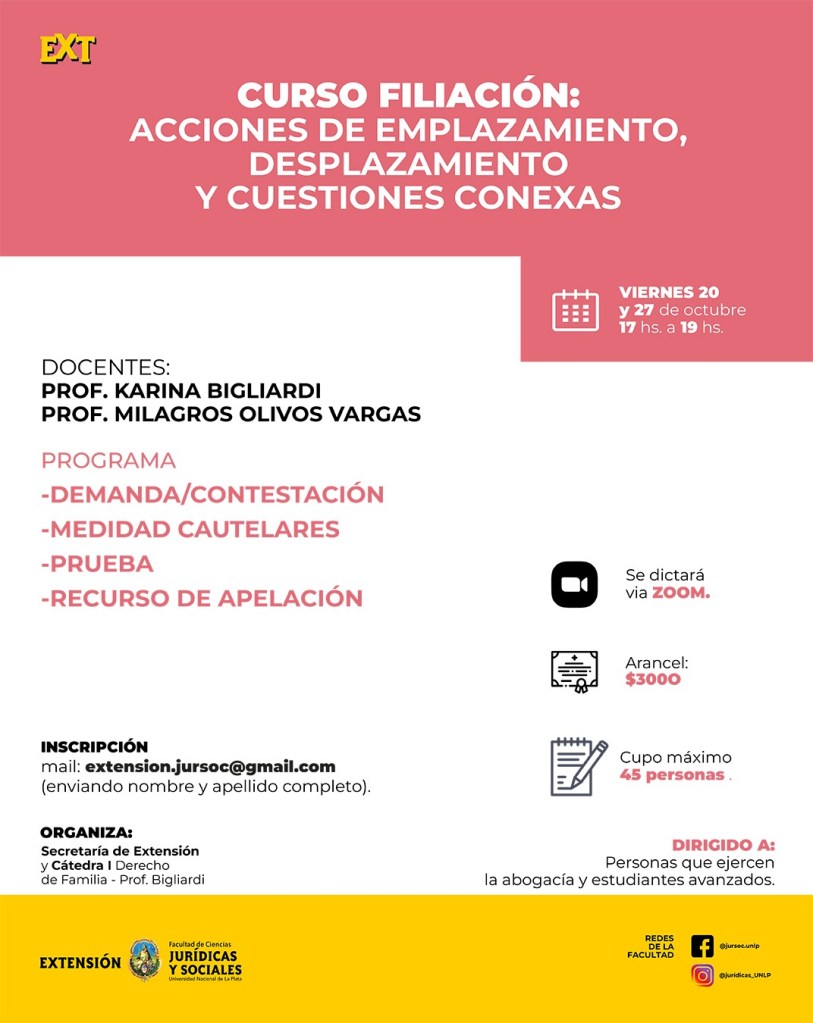 La Secretaría de Extensión y la Cátedra I Derecho de Familia invitan a participar del “CURSO FILIACIÓN: ACCIONES DE EMPLAZAMIENTO, DESPLAZAMIENTO Y CUESTIONES CONEXAS”, el cual se llevará a cabo de manera virtual por plataforma ZOOM los días viernes 20 y 27 de octubre de 17:00 a 19:00 hs.