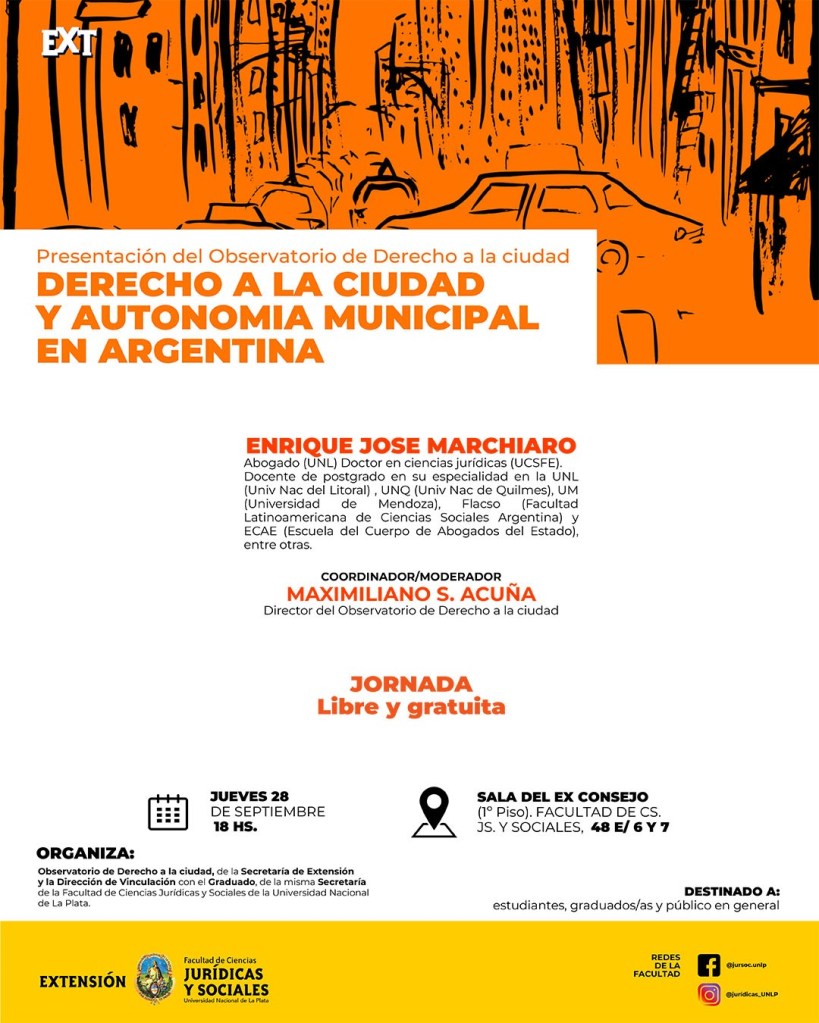 Invitamos a participar de la Conferencia «Derecho a la ciudad y autonomía municipal en Argentina», en el marco de la presentación del «Observatorio de derecho a la ciudad», dependiente de la Secretaría de Extensión.