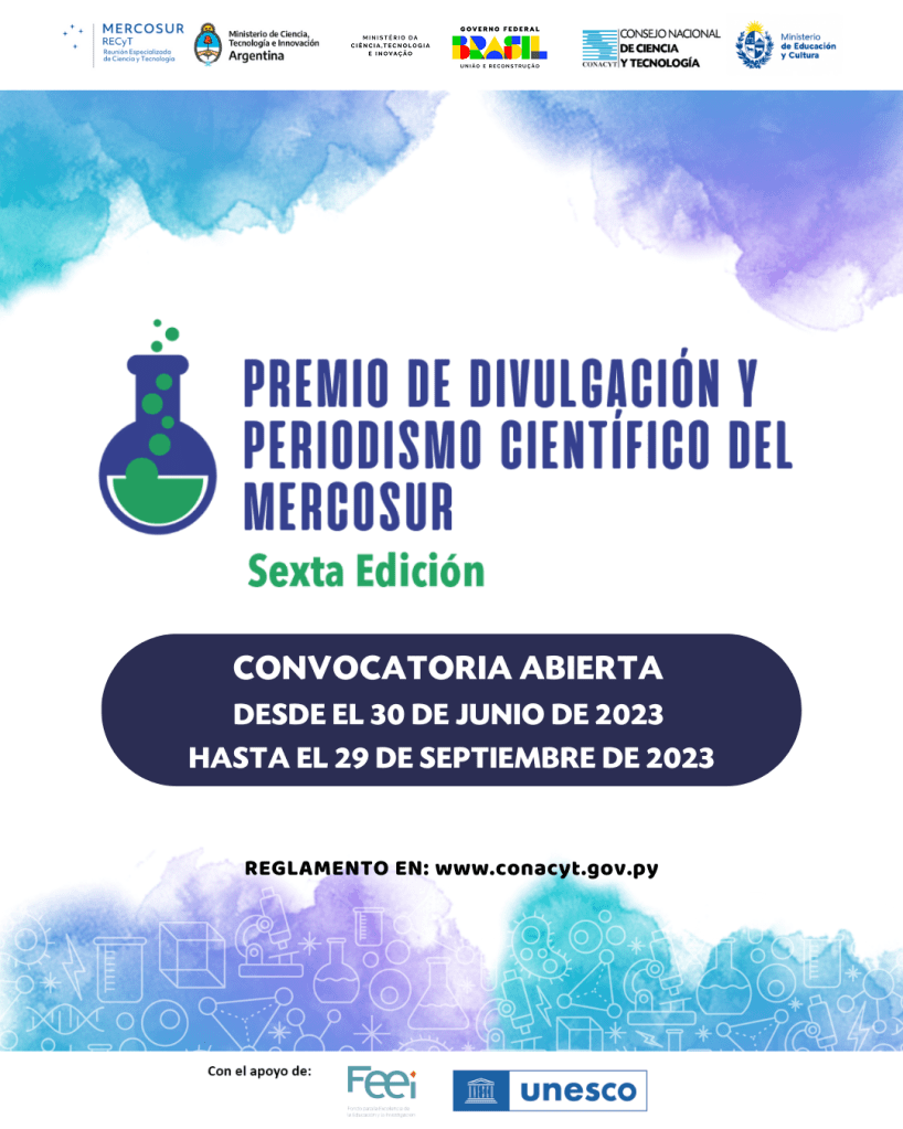 Desde la Dirección de Promoción de la Cultura Científica de la Secretaría de Ciencia y Técnica de la Universidad informan que continúa abierta la convocatoria del Consejo Nacional de Ciencia y Tecnología (CONACYT) a la sexta edición del Premio de Divulgación y Periodismo Científico del MERCOSUR con el apoyo de la Organización de las Naciones Unidas para la Educación la Ciencia y la Cultura (UNESCO), como una iniciativa de la Reunión Especializada de Ciencia y Tecnología del MERCOSUR (RECYT). Esta convocatoria está dirigida a profesionales y estudiantes de periodismo y carreras afines, profesionales de la fotografía, así como a investigadores y divulgadores aficionados de las diferentes áreas de la ciencia, pertenecientes a los países miembros y asociados del MERCOSUR.