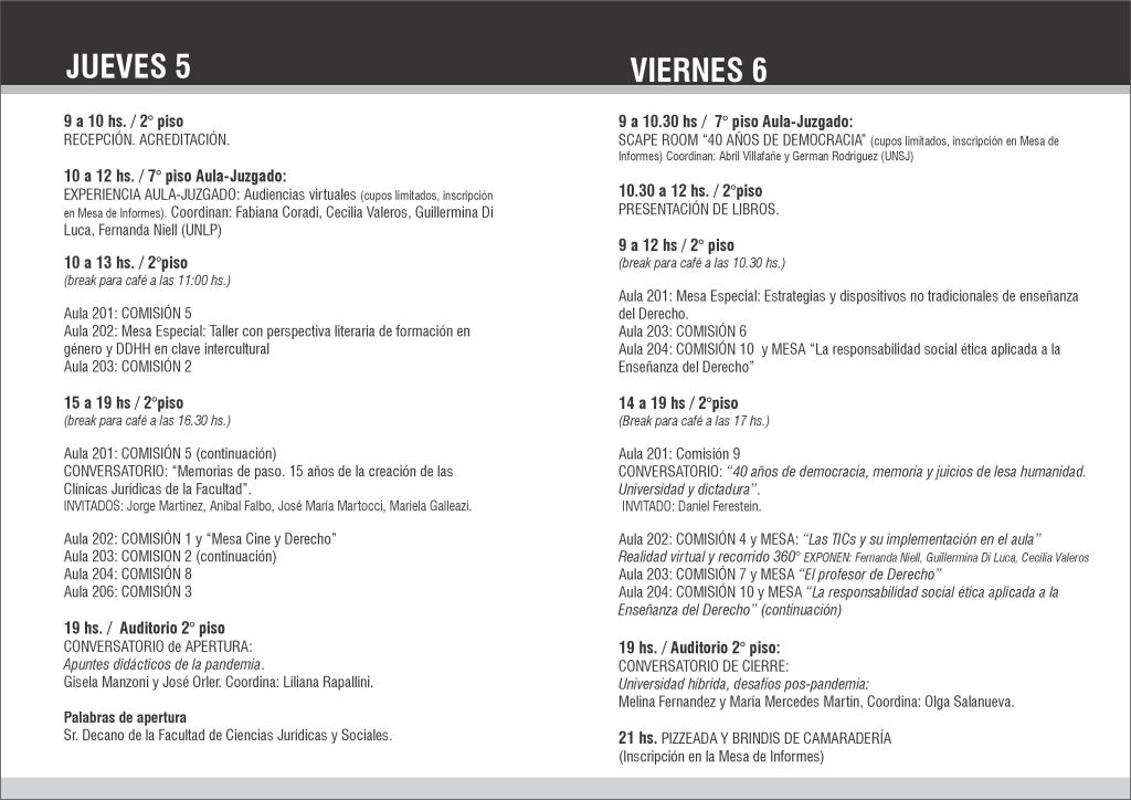 Los próximos jueves 5 y viernes 6 de Octubre se realizará en la Facultad de Ciencias Jurídicas y Sociales de la UNLP, en el 2° piso del Edificio Karakachof, el VI° Congreso Internacional de Enseñanza del Derecho con numerosos Conversatorios, Comisiones de Debate, y actividades tecnológicas especiales como Experiencias 360°, Experiencia Aula-Juzgado con Audiencias en vivo, y juegos de Scape-Room. INSCRIBITE!!