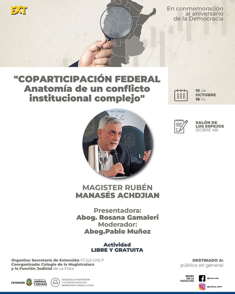 Invitamos a participar de la Conferencia «Coparticipación Federal. Anatomía de un conflicto Institucional complejo» organizada por la Secretaría de Extensión FCJyS-UNLP y Co organizada con el Colegio de la Magistratura y la Función Judicial de La Plata el día martes 10 de octubre a las 18 hs., en el Salón de los Espejos.