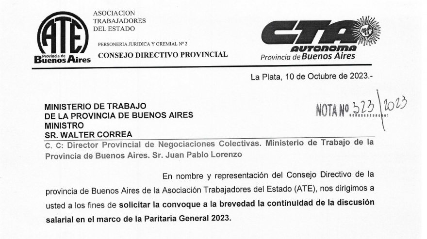 El Consejo Directivo de la provincia de Buenos Aires de ATE solicitó al ministerio de trabajo bonaerense que convoque a la brevedad la continuidad de la discusión salarial en el marco de la paritaria general 2023 de manera urgente.