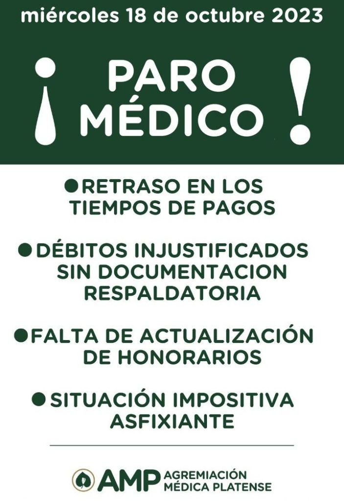 Durante la jornada, los prefesionales de la salud nucleados en la Agremiación Medica Platense realizarán un cese de actividades por la situación que atraviesa el sector privado de la salud a nivel regional.