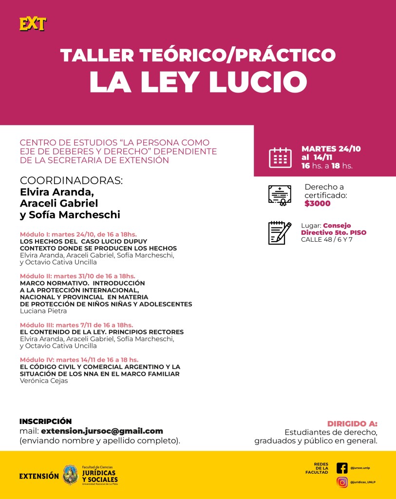 La Secretaría de Extensión los/as invita a participar del «Taller teórico/práctico: LA LEY LUCIO», organizado por el Centro de estudios «la persona como eje de deberes y derecho» dependiente de esta Secretaría, el cual se llevara a cabo los días martes desde el 24 de octubre al 14 de noviembre de 16 hs. a 18 hs. en el Salón Consejo Directivo (5° piso, Edificio de La Reforma).