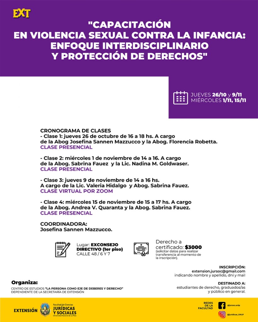 - INSCRIPCIÓN: Al mail extension.jursoc@gmail.com (enviando nombre completo, dni y mail)
