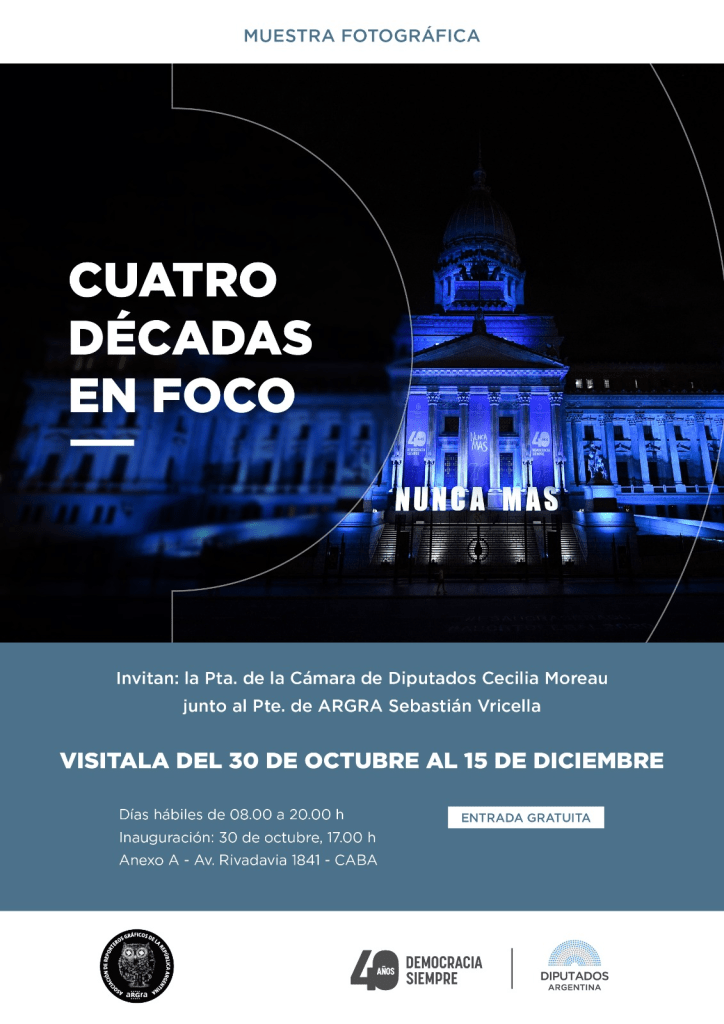 La Presidenta de la Cámara de Diputados, Cecilia Moreau, inaugurará la muestra fotográfica “Cuatro Décadas en Foco”, con motivo de celebrarse los 40 años de la recuperación para siempre de la democracia, el lunes 30 de octubre a las 17 horas en el Anexo “A” de la Honorable Cámara de Diputados de la Nación, ubicado en Avenida Rivadavia 1841 (CABA), con entrada gratuita.