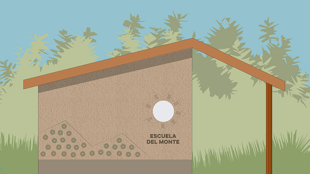 Estas técnicas constructivas dan forma al proyecto Escuela del Monte, una apuesta a la conservación de la biodiversidad local. Desde el inicio del proyecto, el reconocimiento de especies nativas en el terreno fue esencial para pensar en el emplazamiento edilicio.