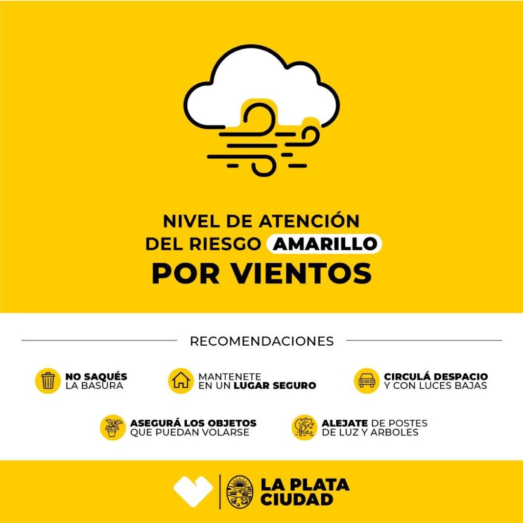 La Municipalidad de La Plata elevó el Nivel de Atención del Riesgo (NAR) a ‘amarillo’ por tiempo ventoso con ráfagas de 60 kilómetros por hora para este lunes. Establecen el monitoreo de las condiciones climáticas y tareas de prevención en la vía pública.