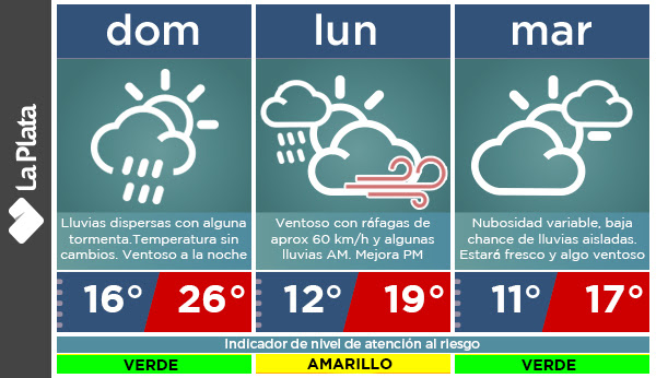Para conocer la información relativa al tiempo actualizada cada cinco minutos, se encuentra disponible la web https://clima.laplata.gob.ar/, que también cuenta con protocolos de actuación barrio por barrio. Además, se pueden consultar las cuentas de Twitter ‘ClimaMLP’ y ‘LaPlataMLP’, y la de Facebook ‘MunicipalidadDeLaPlata’.