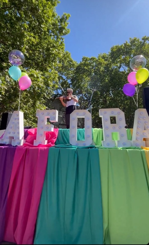 Mientras Amaro hablaba, en el patio delantero de la Facultad, un violinista interpretaba Don’t Let me Down, de Los Beatles, a la par que dos clowns hacían su show de malabares y aros ante una juventud embelesada y sonriente bajo el sol primaveral.
