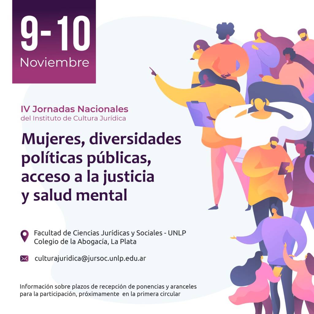 Desde el Instituto de Cultura Jurídica les acercamos la Circular y los flyers de las «IV Jornadas Nacionales del Instituto de Cultura Jurídica: Mujeres, diversidades, políticas públicas, acceso a la justicia y salud mental«, a realizarse los días 9 y 10 de noviembre de 2023 en la Facultad de Ciencias Jurídicas y Sociales, el Centro de Posgrado de la Universidad Nacional de La Plata “Sergio Karakachoff” y el Colegio de la Abogacía La Plata, Ciudad de La Plata, Argentina.