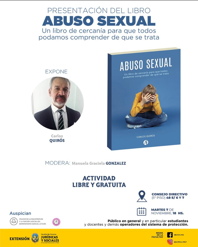 La Secretaría de Extensión los/as invita a participar de la Presentación del libro «Abuso Sexual. Un libro de cercanía para que todos podamos comprender de que se trata», la cual se llevara a cabo el día martes 7 de noviembre a las 18 hs en el Salón Consejo Directivo (5° piso, Edificio de la Reforma).