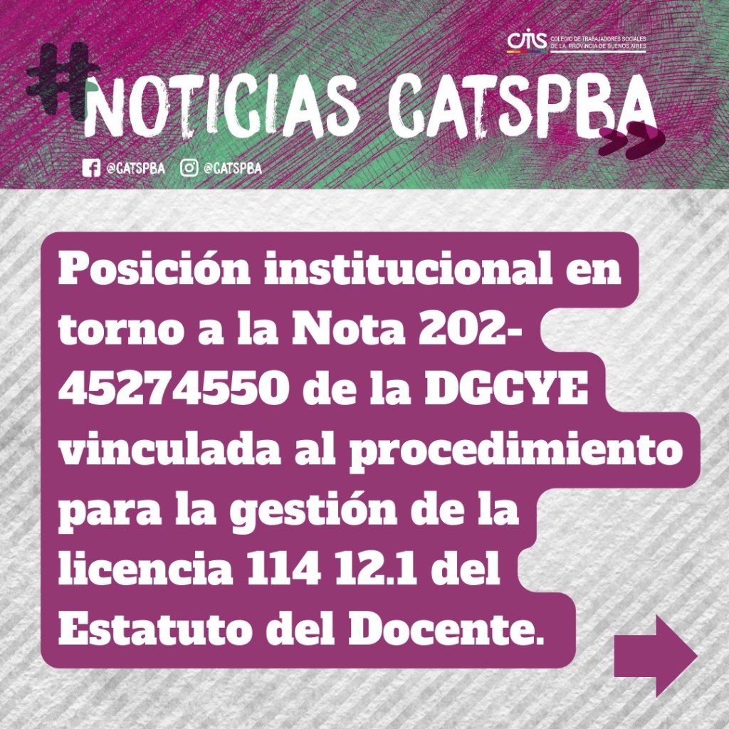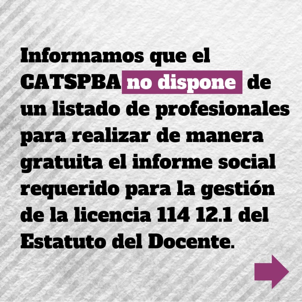 Informamos que el Colegio Provincial de Trabajadorxs Sociales no dispone de un listado de profesionales para realizar de manera gratuita el informe social requerido para la gestión de la licencia 114 12.1 del Estatuto del Docente, tal lo informado mediante la Nota 202- 45274550 de la DGCyE.