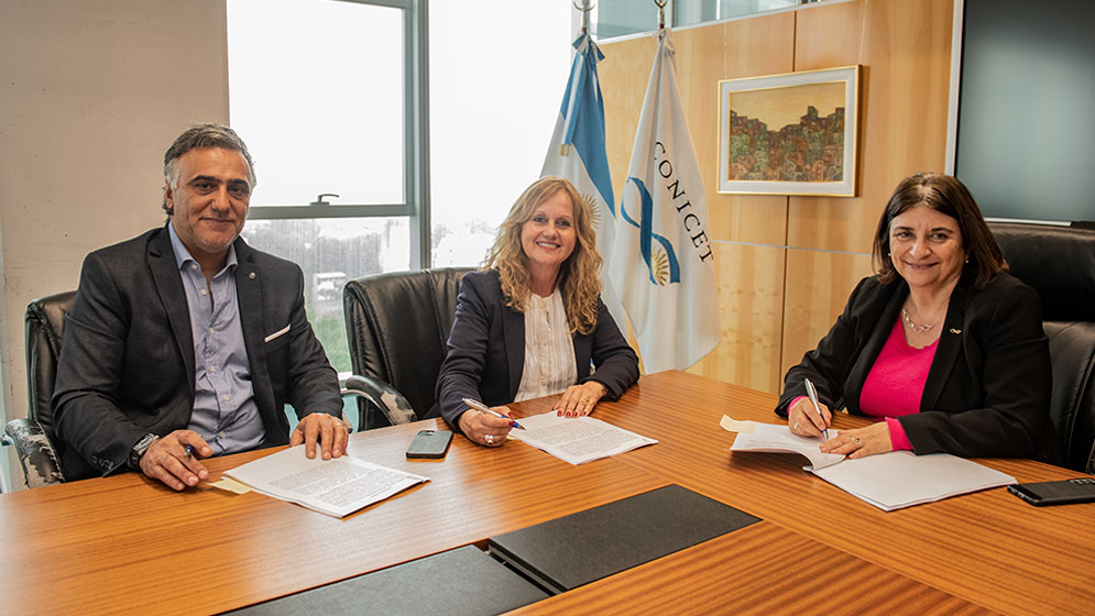 Estuvieron presentes en la firma de convenio para la licencia de tecnología, la directora del CCT CONICET Córdoba María Angélica Perillo, la secretaria de extensión y desarrollo de la UNRC Fabiana D´Eramo y el vinculador responsable de la OVT de Córdoba, Daniel Majul.