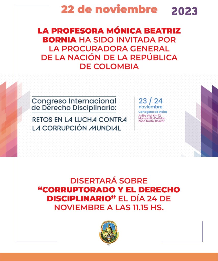 La Profesora Mónica Beatriz Bornia ha sido invitada por la Procuradora General de la Nación de la República de Colombia para participar en calidad de Invitada Especial y Catedrática, al Congreso Internacional en Derecho Disciplinario PGN “Los Retos del Derecho Disciplinario en la lucha contra la Corrupción Mundial” que se llevará a cabo los próximos 23 y 24 de Noviembre de 23, en las Américas Convention Center, Cartagena de Indias, Colombia.