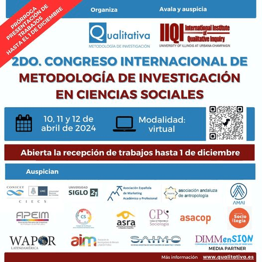 Prórroga para la recepción de trabajos para el 2do Congreso internacional de metodología de investigación en ciencia sociales, que ASRA Sociología Ar auspicia, entre otras instituciones . Adjuntamos flyer, con los datos y links debajo