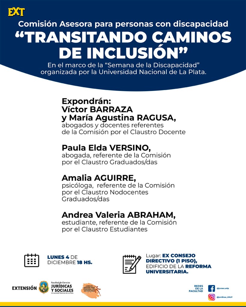 Invitamos a participar de la Charla “Transitando caminos de inclusión”, organizada por la Secretaría de Extensión Universitaria y la Comisión Asesora para personas con Discapacidad de la Facultad de Ciencias Jurídicas y Sociales, la cual se llevará a cabo el lunes 4 de diciembre a las 18:00 hs. en el Salón del Ex Consejo (1º piso, Edificio de la Reforma Universitaria).