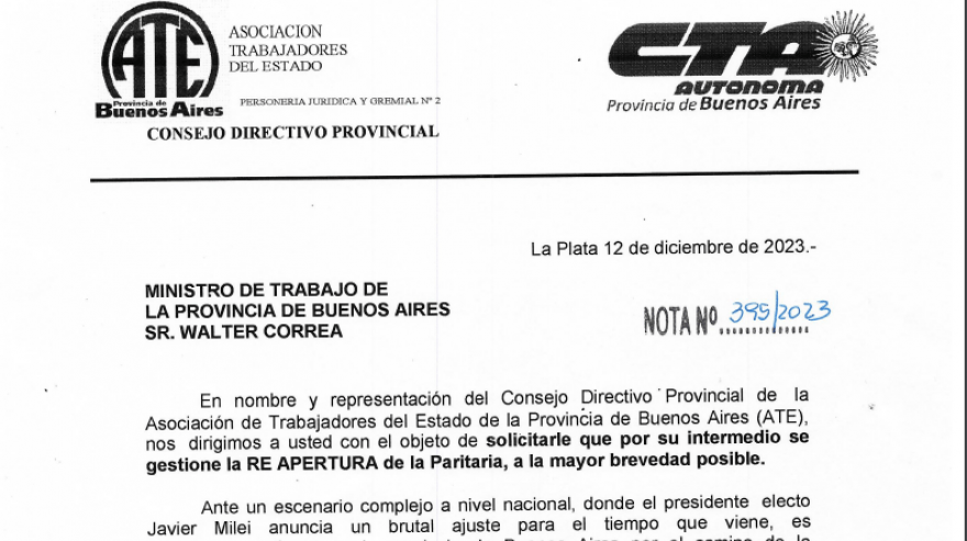 “Ante un escenario complejo a nivel nacional, donde el presidente electo Javier Milei anuncia un brutal ajuste para el tiempo que viene, es necesario continuar en la provincia de Buenos Aires por el camino de la reparación de derechos y sostenimiento de nuestro salario. Sabemos que el ajuste nacional, impone un escenario muy difícil para nuestra provincia en materia de recursos, pero no dudamos que se harán los mayores esfuerzos desde la gestión provincial, para continuar con dicho sendero”, señalaron desde ATE en una misiva que lleva la firma del secretario general del gremio, Claudio Arévalo.