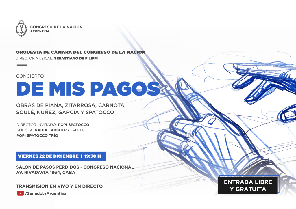LA ORQUESTA DE CÁMARA DEL CONGRESO DE LA NACIÓN OFRECERÁ EL CONCIERTO «DE MIS PAGOS», EL PRÓXIMO VIERNES 22 DE DICIEMBRE A LAS 19.30 H, CON ENTRADA GRATUITA, EN EL SALÓN DE PASOS PERDIDOS DEL PALACIO LEGISLATIVO (AV. RIVADAVIA 1864).