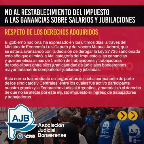 El gobierno nacional ha expresado en los últimos días, a través del Ministro de Economía Luis Caputo y del vocero Manuel Adorni, que se estaría avanzando con la decisión de derogar la Ley 27.725 sancionada este año que eliminó la 4ta. categoría del Impuesto a las ganancias y que beneficia a más de 1 millón de trabajadores y trabajadoras de todo el país entre ellos gran cantidad de judiciales bonaerenses mayoritariamente compañeros jubilados y jubiladas.