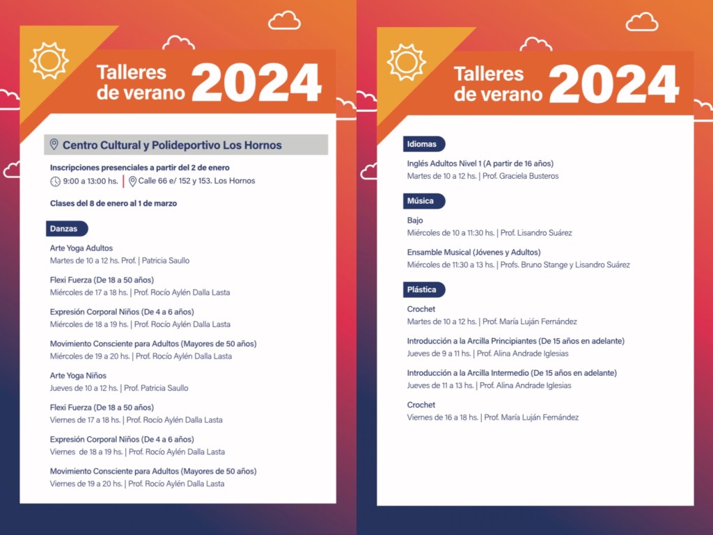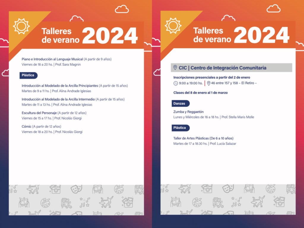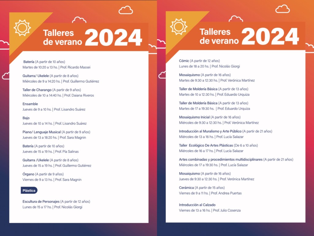 Según informaron desde la Comuna, la Escuela Taller de Arte iniciará las clases el lunes 8 de enero y finalizarán el viernes 1° de marzo. Los interesados deberán acercarse obligatoriamente de manera presencial para completar el formulario de inscripción en los mencionados espacios municipales.