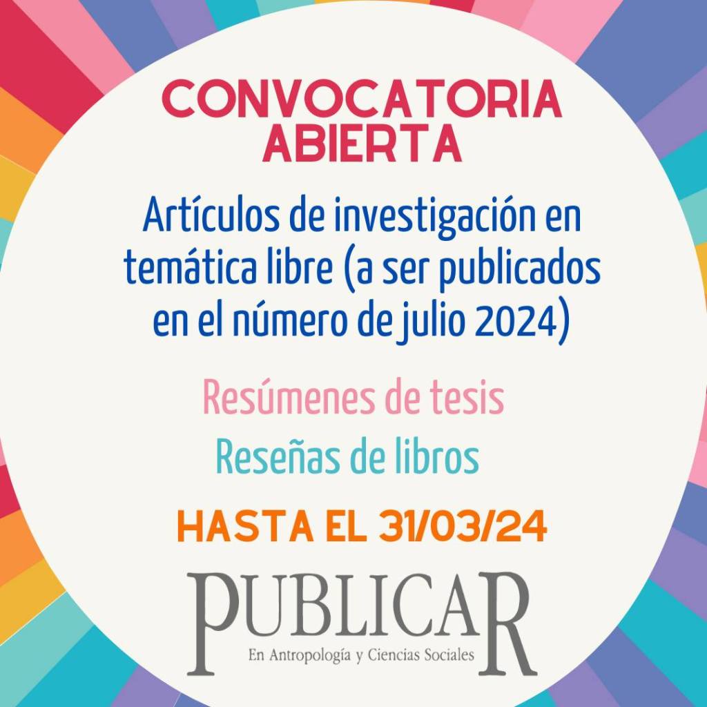 PUBLICAR en Antropología y Ciencias Sociales abre la convocatoria a artículos libres para su número Julio 2024. Fecha límite 31/03/24 Toda la información sobre condiciones para el envío de artículos y normas editoriales está disponible en: