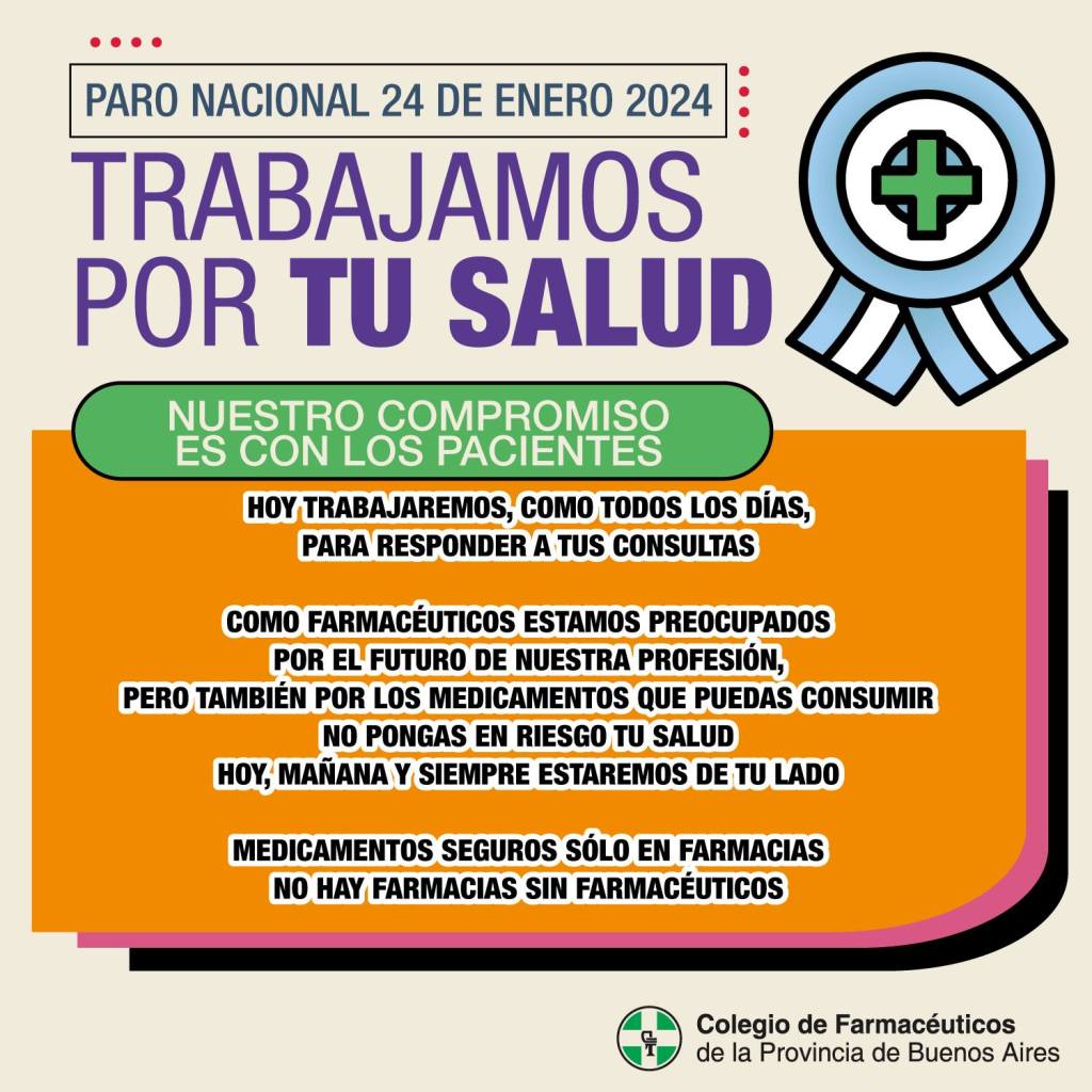 Los farmacéuticos de la provincia de Buenos Aires ratificamos nuestra voluntad y decisión de defender las leyes 10606 y 11405, que regulan la producción, distribución y dispensa de medicamentos y el servicio de farmacéuticos a millones de bonaerenses.