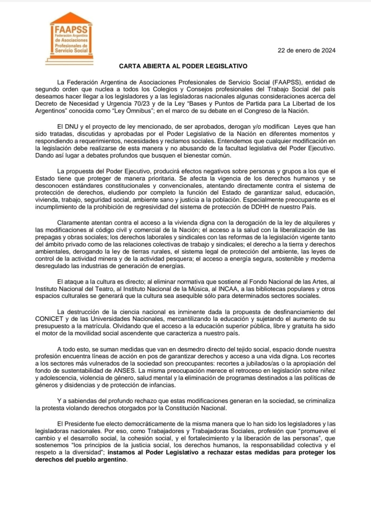 23 enero, 2024 clipurbanodenoticias La FAAPSS publicó una «Carta abierta al poder legislativo» pidiendo el rechazo del DNU y la Ley Ómnibus /Fuente: Federación Argentina de Asociaciones Profesionales de Servicio Social/ Comparte esto: Compartir en X (Se abre en una ventana nueva) X Comparte en Facebook (Se abre en una ventana nueva) Facebook Más Compartir en LinkedIn (Se abre en una ventana nueva) LinkedIn Compartir en Tumblr (Se abre en una ventana nueva) Tumblr Haz clic en Pinterest (Se abre en una ventana nueva) Pinterest Compartir en Telegram (Se abre en una ventana nueva) Telegram Compartir en WhatsApp (Se abre en una ventana nueva) WhatsApp Me gusta Cargando...