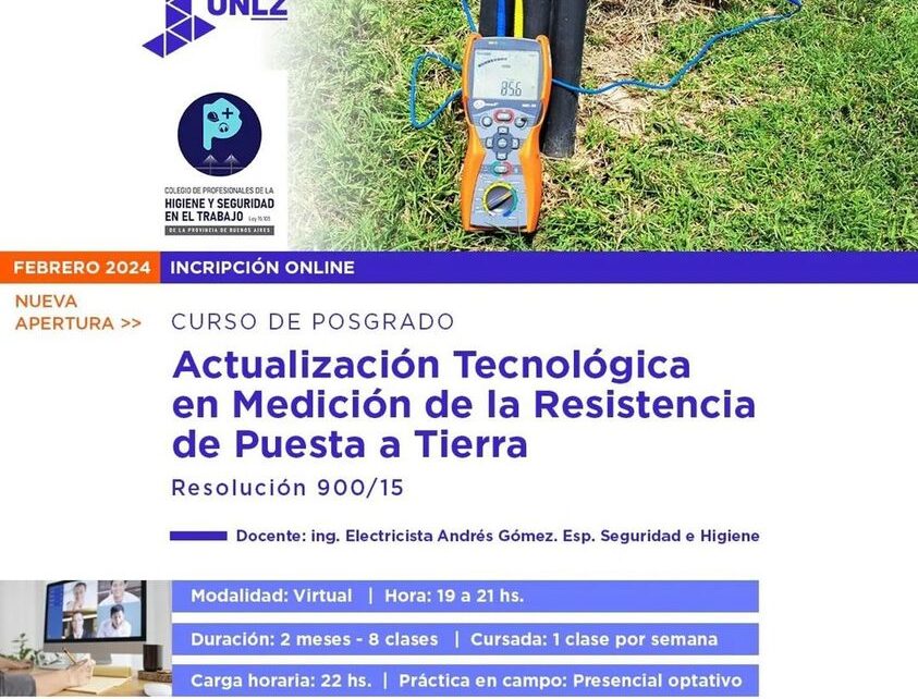 El Colegio de Profesionales de la Higiene y Seguridad en el Trabajo de la Provincia de Buenos Aires informó que está abierta la inscripción para la 2da cohorte del Curso de Posgrado de Actualización Tecnológica en Medición de la Resistencia de Puesta a Tierra, que dicta la Facultad de Ingeniería de la Universidad de Lomas de Zamora.