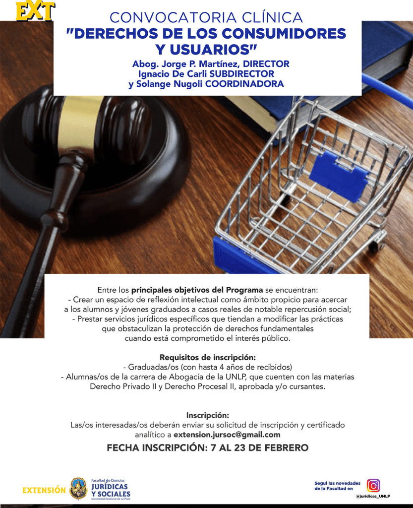 La Secretaría de Extensión Universitaria de la Facultad de Ciencias Jurídicas y Sociales abre la inscripción de aspirantes a formar parte de la Comisión de «Derechos de los Consumidores y Usuarios» del Programa Clínicas Jurídicas, dirigido por el Abog. Jorge P. Martínez.