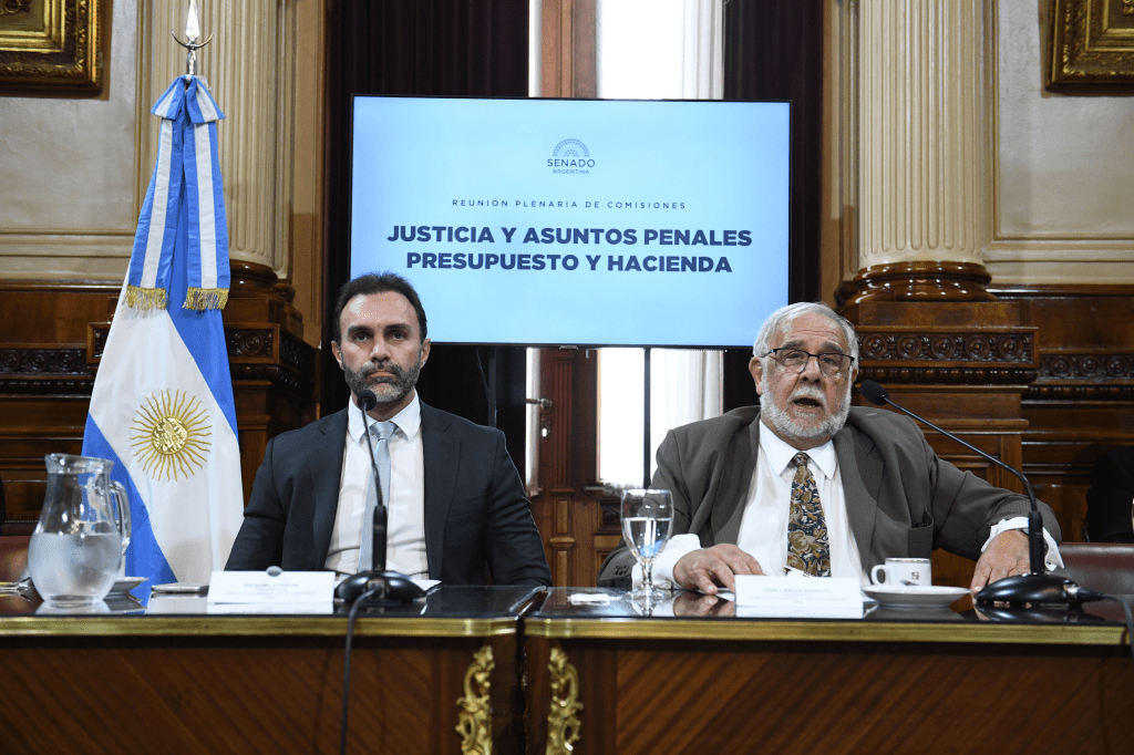Esta tarde, en el Salón Illia, se realizó una plenaria de las comisiones de Justicia y Asuntos Penales y de Presupuesto y Hacienda, que presiden el senador por La Rioja, Juan Carlos Pagotto (LLA) y el senador por Jujuy, Ezequiel Atauche (LLA), respectivamente, para emitir dictamen al proyecto de ley en revisión que modifica el Código Penal respecto de la prevención y represión del lavado de activos, la financiación del terrorismo y el financiamiento de la proliferación de armas de destrucción masiva, luego del cuarto intermedio realizado la semana pasada.