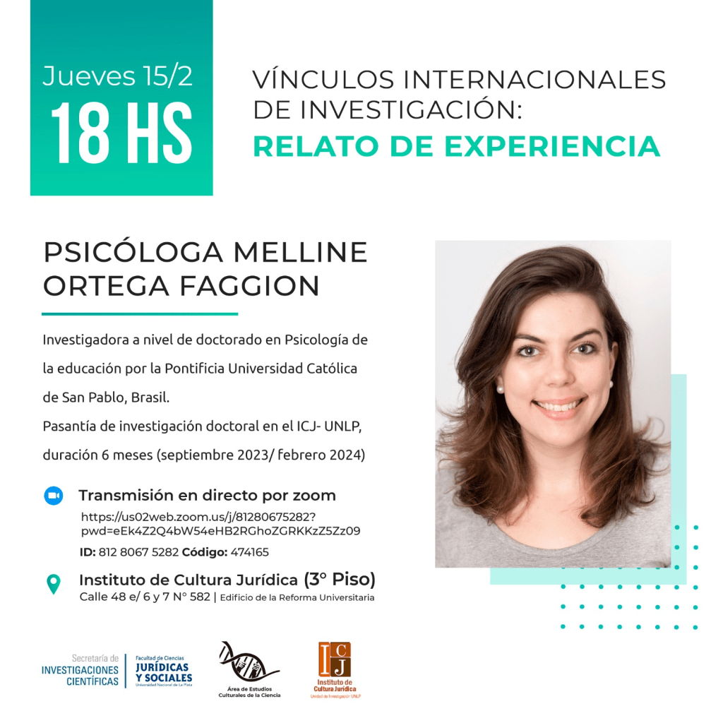 La Secretaría de Investigación Científica invita a participar de la conferencia «Vínculos internacionales de investigación: Relato de experiencia.» en la cual expondrá la Psicóloga Meline Ortega Faggion, de la Pontificia Universidad Católica de San Pablo, quien realizó una pasantía de Investigación Doctoral durante seis meses en el Instituto de Cultura Jurídica, bajo la dirección de la Dra. Marisa Adriana Miranda.