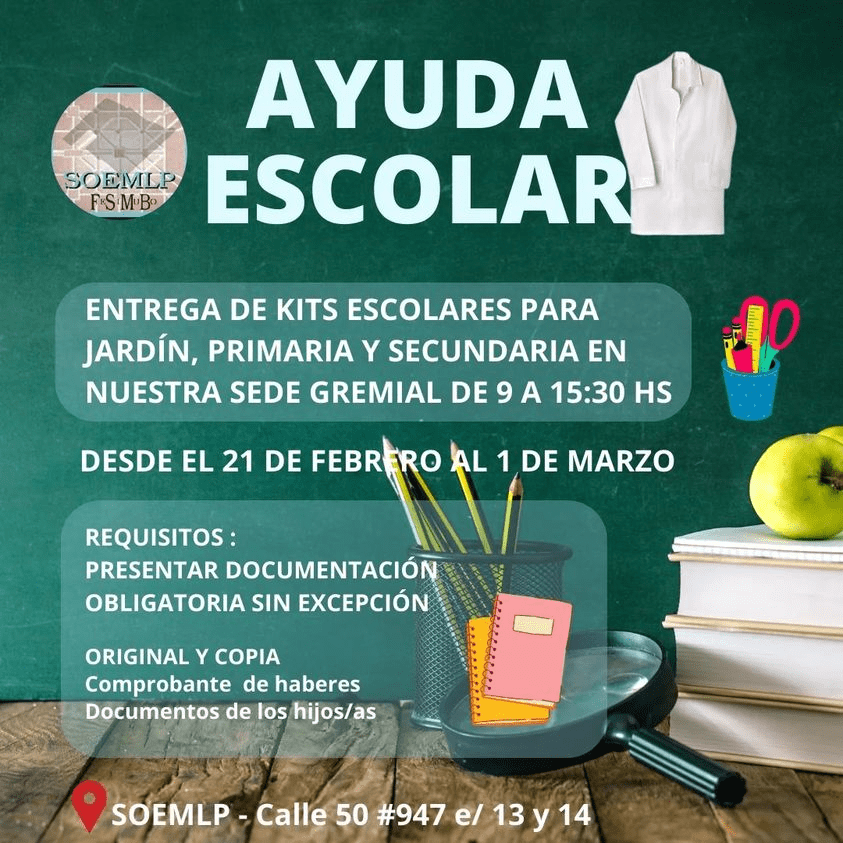 Los esperamos con los kits escolares para jardín, primaria y secundaria desde el miércoles 21 de febrero hasta el 1 de marzo de 9 a 15:30 hs, en nuestra sede gremial.
