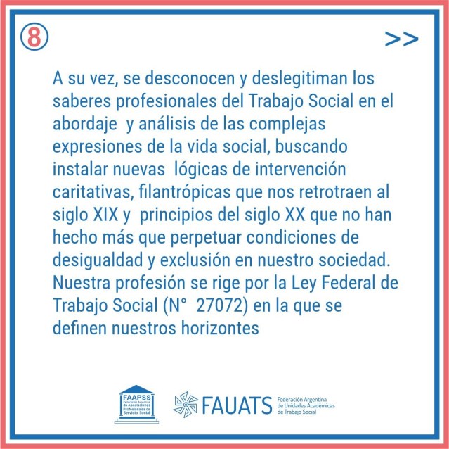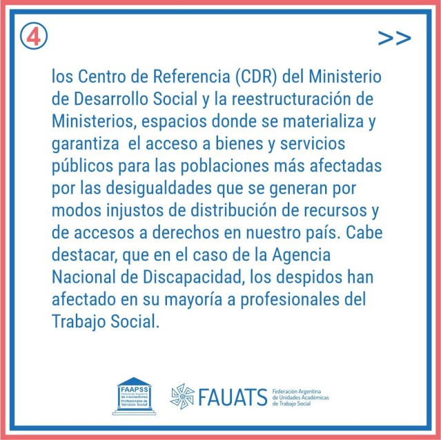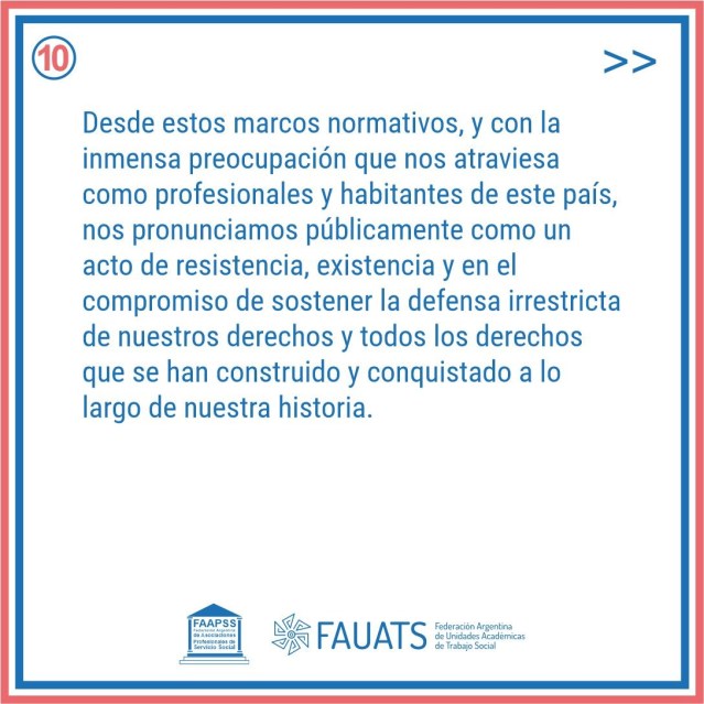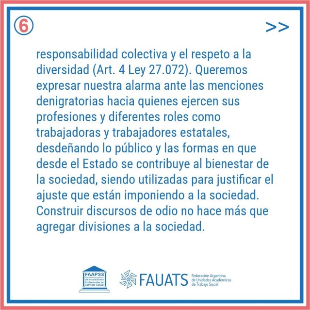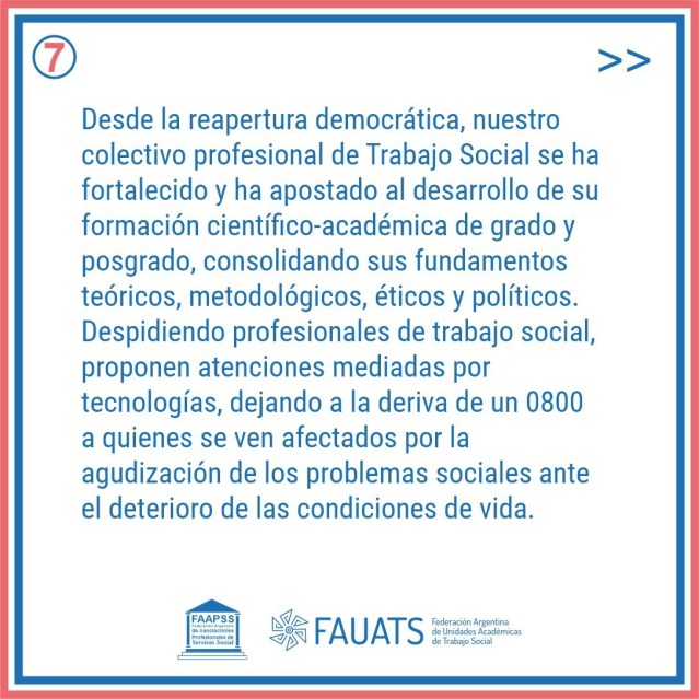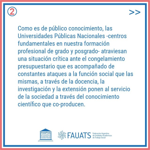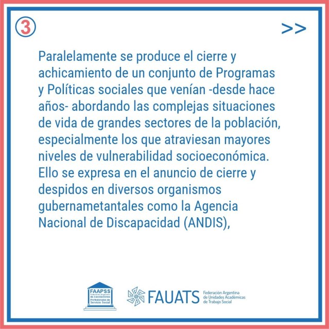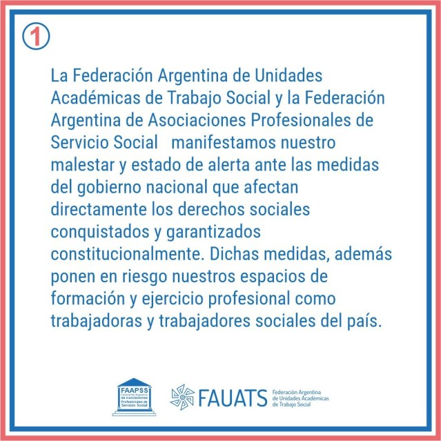 Socializamos pronunciamiento conjunto de la Federación Argentina de Unidades Académicas de Trabajo Social y la Federación Argentina de Asociaciones Profesionales de Servicio Social frente a las medidas del gobierno nacional que afectan derechos sociales.