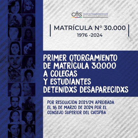 En el marco del Archivo Histórico Dictadura y Trabajo Social, el Consejo Superior del Colegio Profesional instauro la posibilidad de otorgar la Matrícula Profesional N° 30000 a colegas y estudiantes detenidxs desaparecidxs en la última Dictadura Cívico-Militar.
