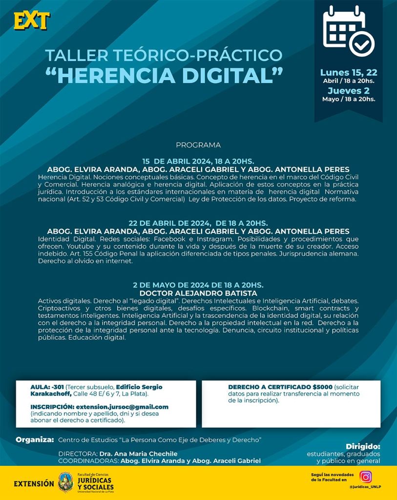 La Secretaría de Extensión los/as invita a participar del «Taller teórico/práctico: HERENCIA DIGITAL», organizado por el Centro de estudios «La persona como Eje de Deberes y Derecho» dependiente de esta Secretaría, el cual se llevara a cabo los días lunes 15 y 22 de abril y jueves 2 de mayo de 18 hs. a 20 hs. en el Aula -301, (3º Subsuelo, Edificio Sergio Karakachoff).