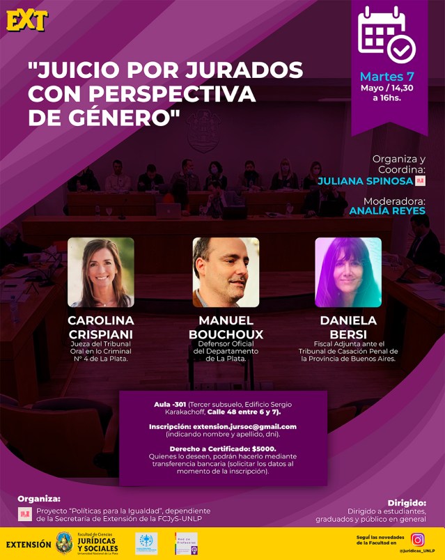 La Secretaria de Extensión Universitaria invita a participar de la Jornada “Juicio por jurados con perspectiva de género», organizada por el Proyecto «Políticas para la igualdad», dependiente de la Secretaría de Extensión de la FCJyS-UNLP., la misma se dictará de manera presencial el día martes 7 de mayo del corriente año, de 14:30 a 16hs.