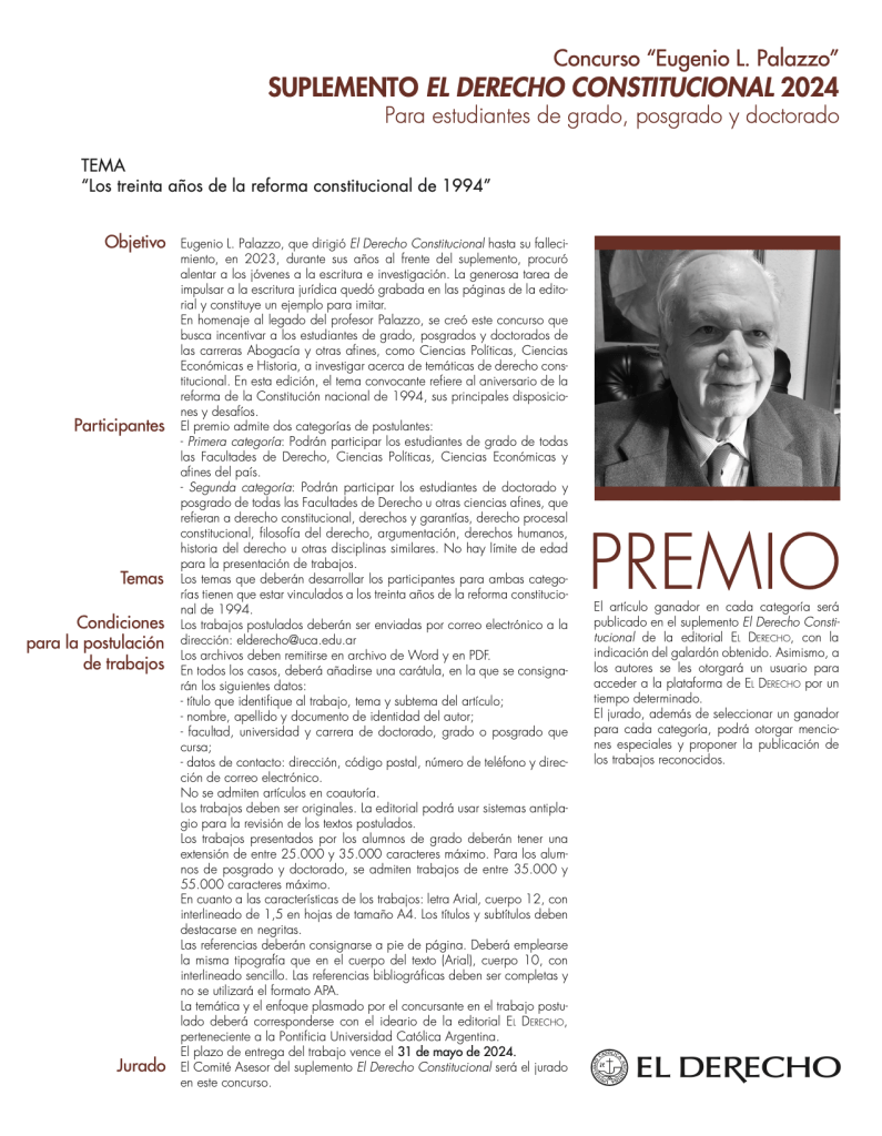 Concurso “Eugenio L. Palazzo” Suplemento «El Derecho Constitucional 2024» para estudiantes de grado, posgrado y doctorado