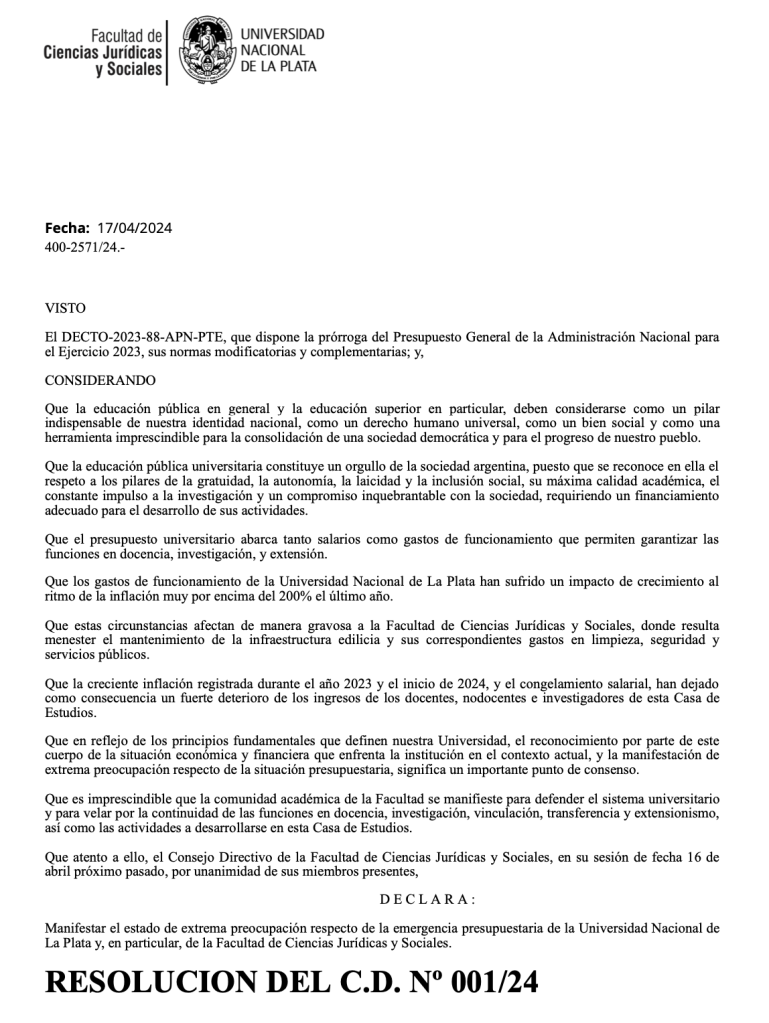 El Consejo Directivo en la última sesión del día martes 16 de abril, dictó la siguiente resolución, atento a la preocupación que existe por la situación financiera de las Universidades Nacionales Argentinas.