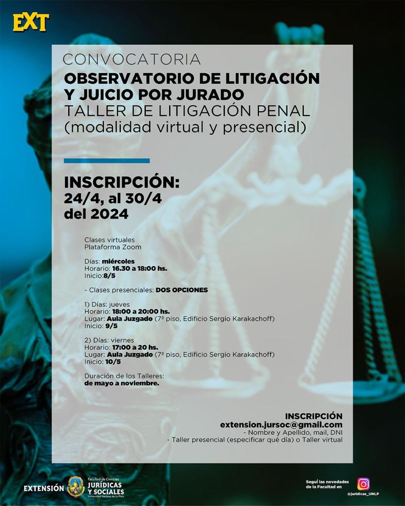 La Secretaría de Extensión Universitaria informa que se encuentra abierta la inscripción al Taller de Litigación Penal dependiente del “Observatorio de Litigación y Juicio por Jurado”, el cual se dictará en modalidad virtual y presencial, pudiendo el/la interesado/a optar por una de las dos opciones.
