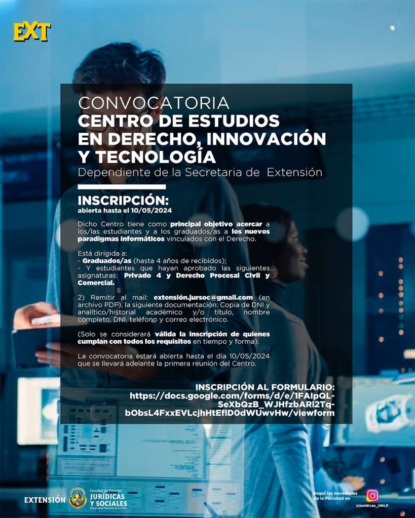 Se encuentra abierta la primera convocatoria a formar parte del “CENTRO DE ESTUDIOS EN DERECHO, INNOVACIÓN Y TECNOLOGÍA”, dependiente de esta Secretaría de Extensión Universitaria.