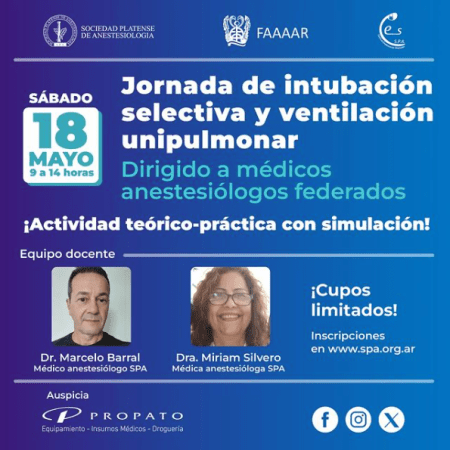 La Sociedad Platense de Anestesiología invita a la «Jornada de intubación selectiva y ventilación unipulmomar»