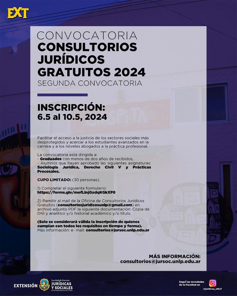 Más información: e- mail: consultorios@jursoc.unlp.edu.ar