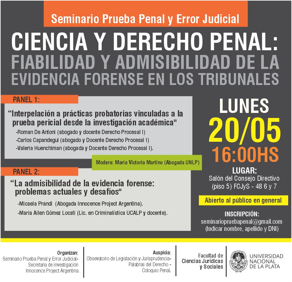 La Secretaría de Investigación Científica de la Facultad de Ciencias Jurídicas y Sociales de la Universidad Nacional de La Plata, tiene el agrado de invitar a participar en el Seminario Prueba Penal y Error Judicial «Ciencia y Derecho Penal: Fiabilidad y admisibilidad de la evidencia forense en los tribunales» que se realizará el día lunes 20 de mayo del corriente a las 16hs en el Salón del Consejo Directivo de la Facultad (Piso 5to).