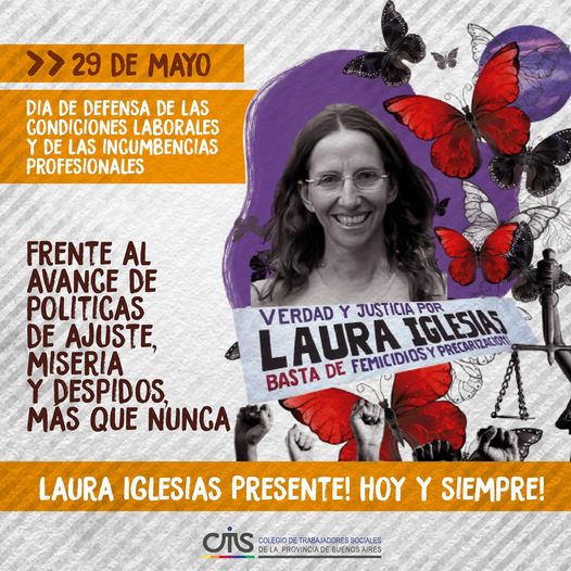 La incansable lucha en el pedido de Verdad y Justicia, se hizo reflejo de la situación que vivencian muchas mujeres con las que cotidianamente trabajamos, pero también, se nos hizo cuerpo porque Laura podemos ser cada una de nosotras que sufrimos violencia institucional, acoso laboral y las inhumanas expresiones de la desigualdad género. Por ello, desde Trabajo Social, en el nombre de Laura levantamos la bandera para que todos los femicidios se instalen en la agenda pública y por la permanencia de las políticas de género.