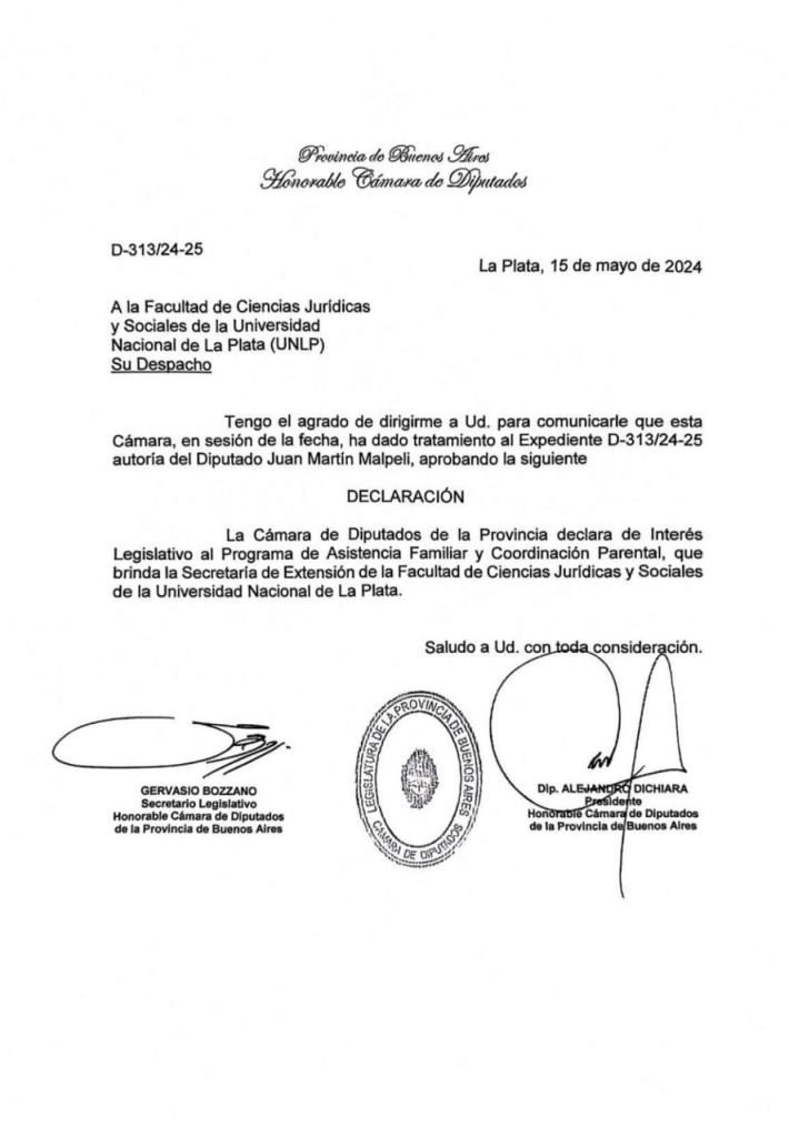 El 15 de mayo del corriente año se aprobó el Proyecto del Diputado Juan Martín Malpeli que declara de Interés Legislativo al Programa de “Asistencia Familiar y Coordinación Parental” que depende de la Secretaría de Extensión Universitaria de la Facultad de Ciencias Jurídicas y Sociales de la Universidad Nacional de La Plata ante la Honorable Cámara de Diputados de la Provincia de Buenos Aires.