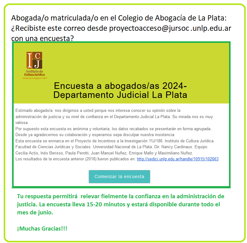Desde el Proyecto de Investigación 11/J186 «Vistualización y confianza en la justicia: La mirada de los y las abogados/as» de la Directora Nancy Cardinaux invitan a participar a los Abogados/as matriculados/as en el Departamento Judicial La Plata en una encuesta anónima sobrela adminsitración de justicia y su nivel de confianza.