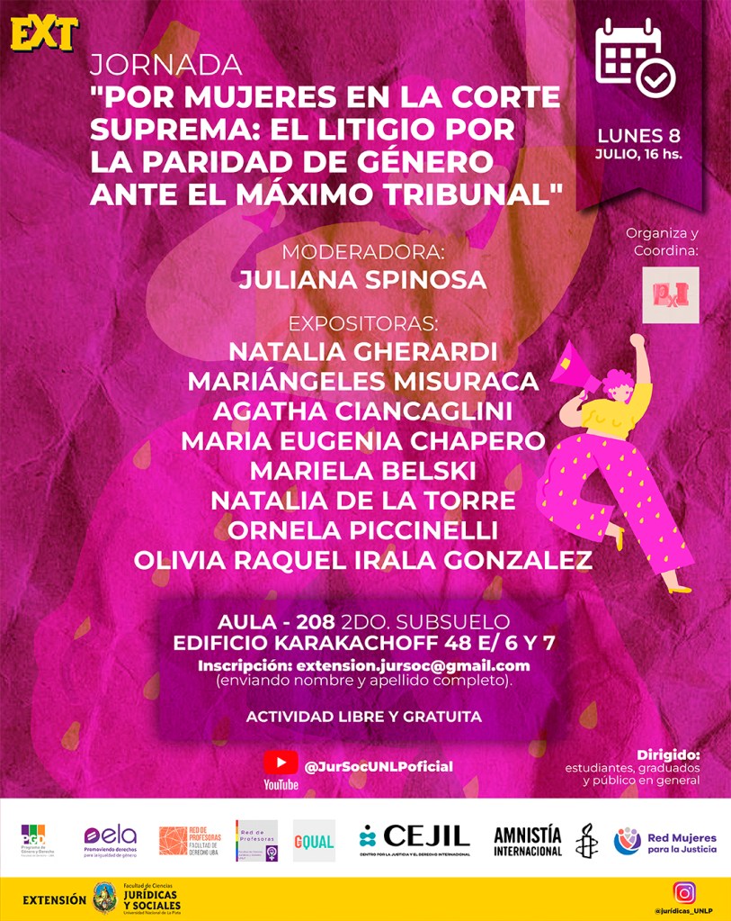 Las/os invitamos a participar de la jornada «Por mujeres en la Corte Suprema: el litigio por la paridad de género ante el máximo tribunal», organizada por el proyecto “Políticas para la Igualdad» dependiente de la Secretaría de Extensión Universitaria la cual se llevará a cabo el día lunes 8 de julio de 16hs.18 hs en aula -208 (segundo subsuelo) Edificio karakachoff calle 48 e/ 6 y 7.