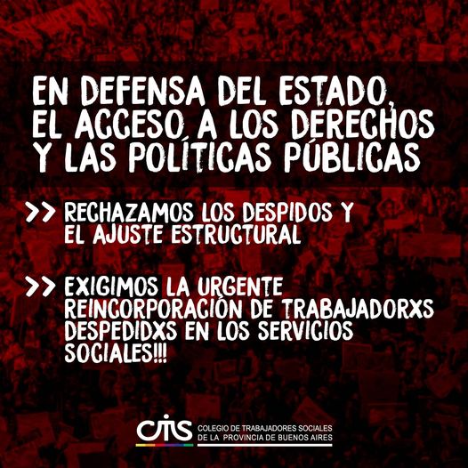 Ante los despidos de trabajadorxs y colegas con desempeño en Hospital Posadas; CDR, CAJ, Ex Ministerio de Mujeres, Género y Diversidad; Ex Ministerio de Desarrollo Social, Secretaria de Derechos Humano, y otros servicios sociales, con sus implicancias tanto en nuestro colectivo profesional así como en la calidad de los servicios sociales que garantizan derechos de la población empobrecida, desde el CATSPBA acompañamos el reclamo y exigimos la inmediata reincorporación de lxs trabajadorxs y la revisión de las decisiones que fundamentan el desmantelamiento de las políticas pública