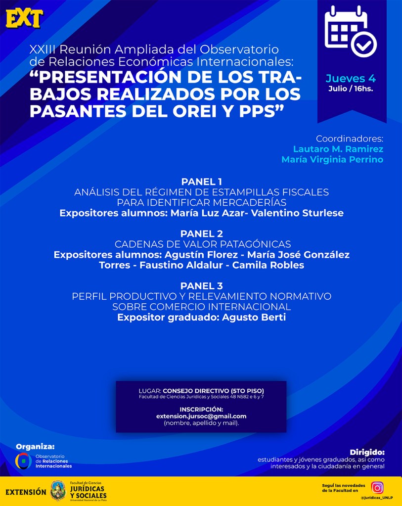 La Secretaria de Extensión invita participar de la XXIII Reunión Ampliada del Observatorio de Relaciones Económicas Internacionales: “Presentación de los Trabajos Realizados por los pasantes del OREI y PPS, la cual se llevará a cabo el día jueves 4 de julio a las 16hs., en el Salón Consejo Directivo 5° piso, Edificio de la Reforma.